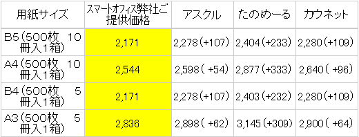 そこで気になるコピー用紙の価格ですが、サイズ別の最安値が下表のように変わりました。