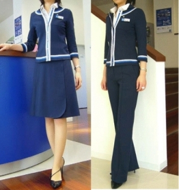 会社のCIカラーである、きれいな明るいブルーを基本に、今年らしいノーカラージャケット、それに優しいラウンドカラーのシャツブラウスを合わせて、ジャケットを脱いだ時でもきっちり感を残します。