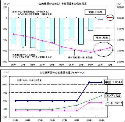 ○2009 年、中国・インド・ロシア等の一部新興国が保有高を大きく増やしたことで、全世界の公的機関の金保有高が増加に転じた。ソブリン・リスク(国家の信用リスク)が高まるなか、ドルやユーロへの不安から無国籍通貨「金」を外貨準備に組み入れる動きが広がり、2010 年には従来の売り手だった公的機関は買い手に転じると予想されている。